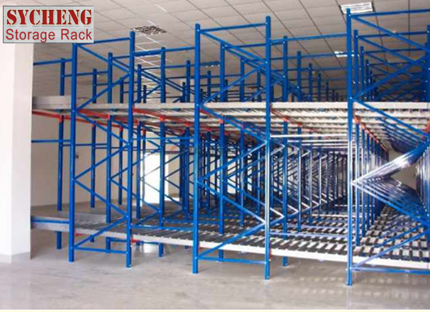 適合先進先出、流量較大的產品。重型貨架利用滾軸滑動使貨物達到自動存貨流轉,空間利用率達85%。適合冷庫,物流配送中心等大型倉庫管理使用。普通平衡式叉車可操作。