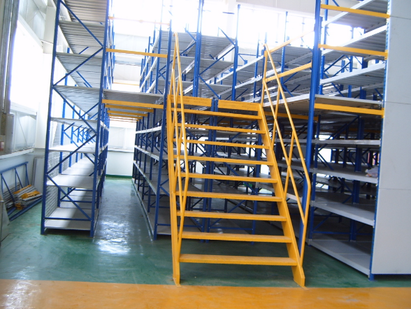 除此之外,下層是貨架形式,上層可以是平臺也可以是貨架的結構。底層貨架既可以存儲物料又是樓面的支撐。附件可配樓梯、扶手、提升機及照明系統等。不僅提升了存儲的空間,而且給生產運輸提供了方便。