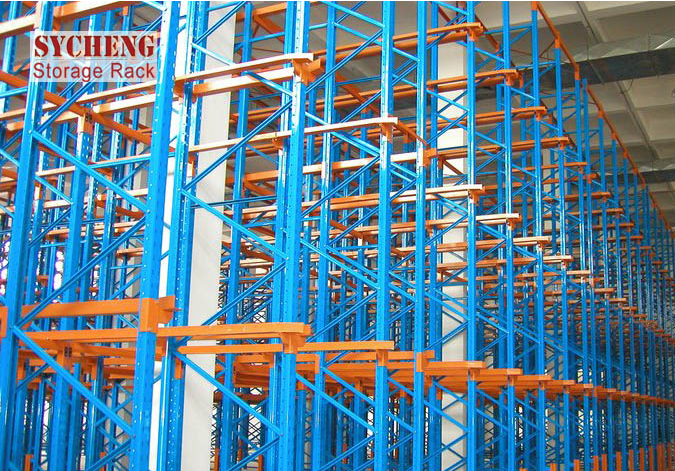 駛?cè)胧截浖苁前褦?shù)排傳統(tǒng)式貨架連接起來,沒有專用的走道,其配置方式可以為兩組駛?cè)胧截浖鼙硨?duì)背安裝或單一組靠墻,叉車的進(jìn)出皆使用相同的走道。存放時(shí)先由內(nèi)部存放,再依序向外存放,而出貨時(shí)先由外部貨物取出,再向內(nèi)依次取貨,儲(chǔ)存密度非常好, 但不能先進(jìn)先出。適合周期性批量作業(yè)及存取物料頻率高的原料倉庫或轉(zhuǎn)運(yùn)倉庫產(chǎn)品。