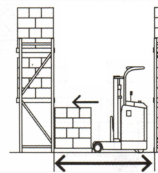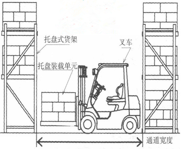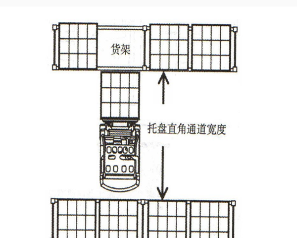圖3為托盤貨架實用直角通道寬度。為了使叉車在托盤貨架之間自由儲存作業(yè),托盤必須具備最小的通道寬度。