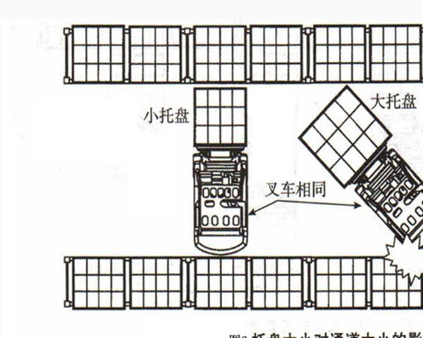 一般通道寬度是按照1.1m*1.1m的標(biāo)準(zhǔn)托盤來設(shè)計的。托盤規(guī)格尺寸變大要求的通道寬度也相應(yīng)增加。圖6為托盤大小對通道大小的影響。