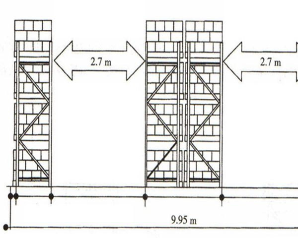 圖2為托盤規(guī)格為1.1m*1.1m的托盤貨架的叉車通道寬度。為便于叉車作業(yè)4排托盤貨架的叉車通道寬度為2.7m。4排貨架的總儲存部分寬度4.55m,兩個叉車通道寬度占5.4m。