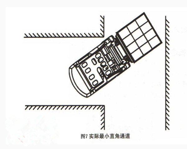 圖7中,叉車實際最小直角通道寬度與叉車和托盤的種類有關(guān)。一般情況是理論最小直角通道加200mm為實際最小直角通道。