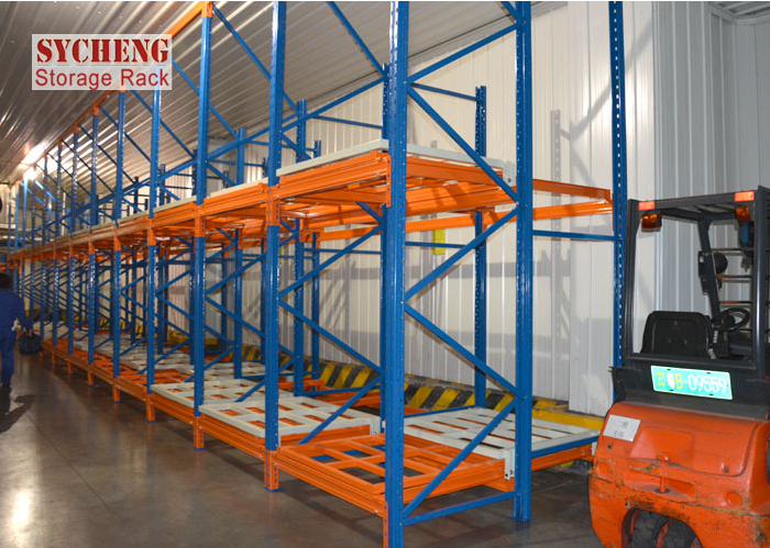 重力式貨架是倉儲貨架中的一種,其原理是在貨架每層的通道上,都安裝有一定坡度的(入庫端高度高于出庫端)、帶有軌道的導軌,入庫的托盤貨物在重力 的作用下,由入庫端流向出庫端。在貨架的組與組之間沒有作業通道,從而增加了60%的空間利用率,提高了倉儲的容積率;托盤操作遵循先進先出的原則;自動 儲存回轉;儲存和揀選兩個動作的分開大大提高輸出量,由于是自重力使貨物滑動,而且沒有操作通道,所以減少了運輸路線和叉車的數量。